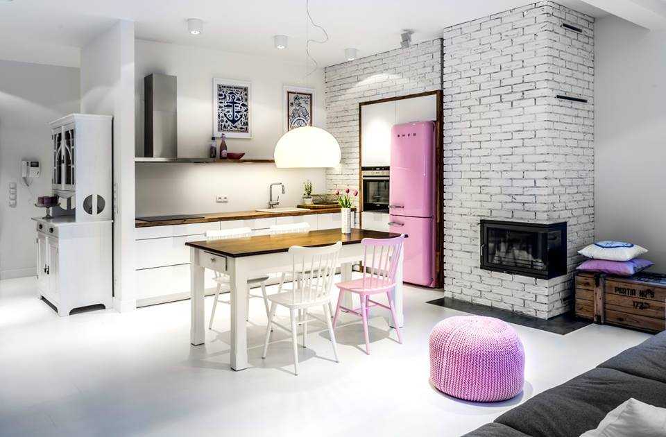 В обеденной зоне отлично будет смотреться камин, как настоящий, так и искусственный.