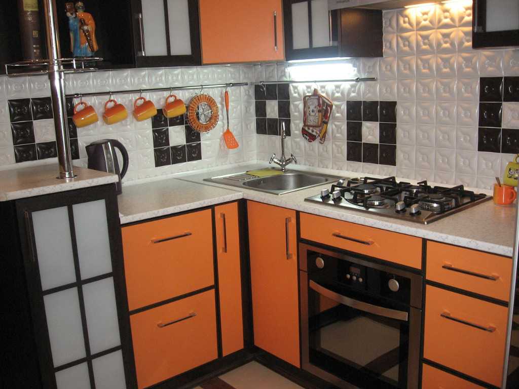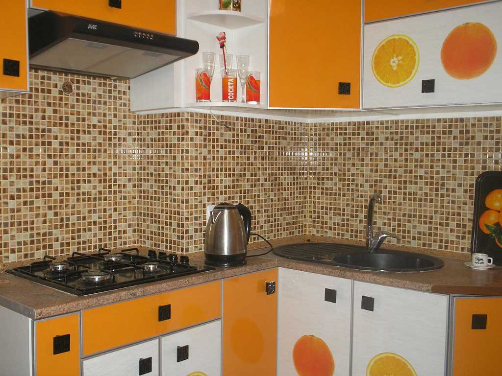 Кухонный фартук — он может быть полностью оранжевым при условии, что в кухонном гарнитуре этот цвет не является доминирующим. В качестве отделочного материала можно использовать керамическую плитку, стекло и даже кирпич. Особенно интересно будет выглядеть фартук из мозаики, сочетающей оранжевые и черные тона.