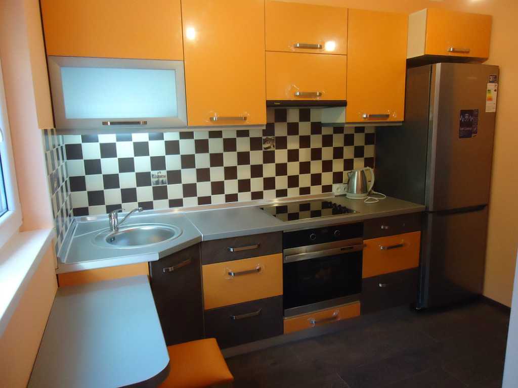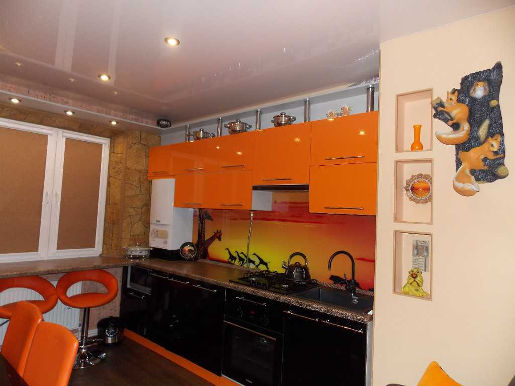 Кухонный гарнитур — выбирая этот элемент интерьера, предпочтение следует отдавать современной модели, с глянцевыми фасадами, стеклянными и металлическими деталями, подсветкой. Дело в том, что оранжевый цвет больше подходит для стиля хай-тек, поэтому гарнитур должен быть соответствующим.