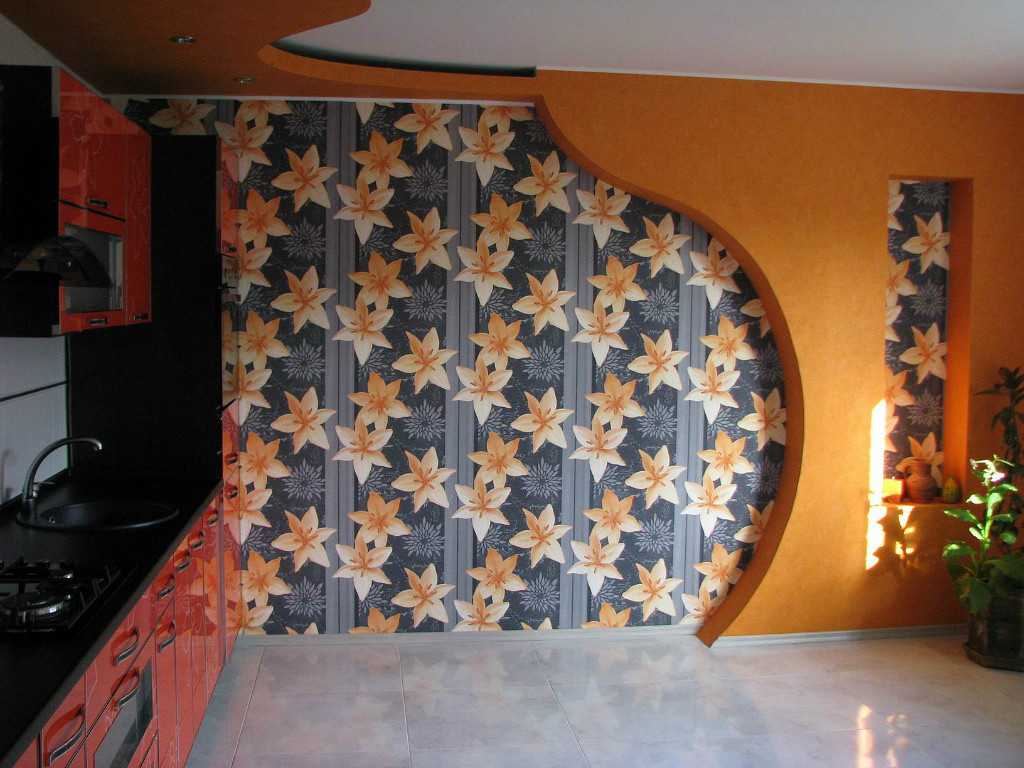 Для стен на кухне, будут уместны моющиеся обои, мозаика, кафель или керамика. Очень необычным видом отличаются жидкие обои с мелкими вкраплениями или обычные полотна с изящными цветочными рисунками или извилистыми линиями. В оформлении рабочей зоны практичней всего применить плитку или скинали с рисунками цветов, натюрмортов и прочего.