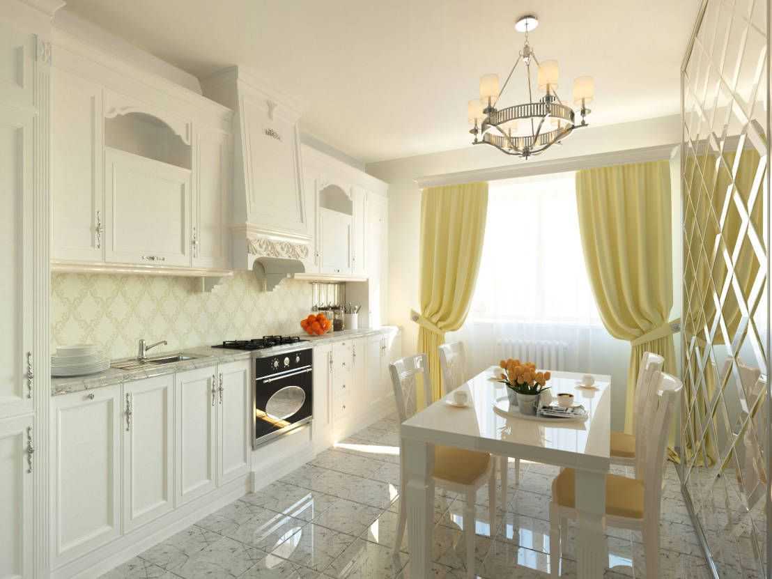 Вычурность, величие и роскошь стилистического направления подчеркнёт классический белый или коричневый кухонный гарнитур, размещённый на фоне стен желтого цвета.