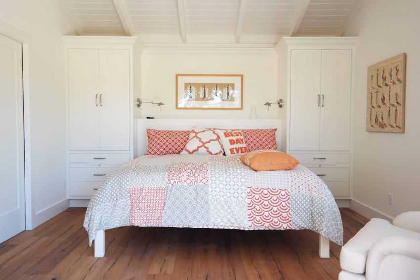Нередко площадь в хрущевках доходит лишь до 6 кв. м. Для одного человека ее будет хватать, если поместить полуторную кровать и шкаф. Останется место даже для тумбочки или небольшого стола. Когда в квартире живут несколько человек, и спальня рассчитана на семейную пару, то кровать ставят двуспальную. Учитывая небольшие габариты пространства, останется место лишь для одного предмета мебели. Это может быть либо шкаф, либо комод.