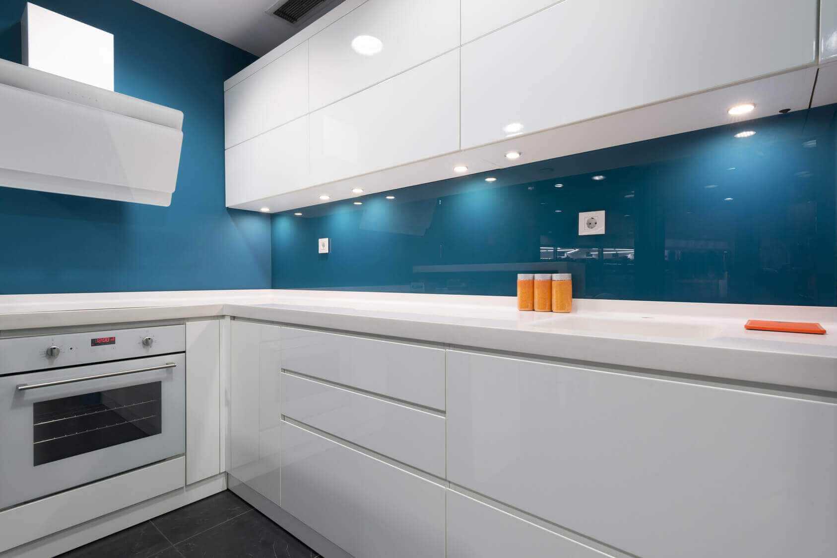 Стеклянный фартук является самым практичным и доступным на сегодняшний день решением в отделке кухни. Еще лучше, если он дополнен подсветкой, как в варианте на фотографии выше.