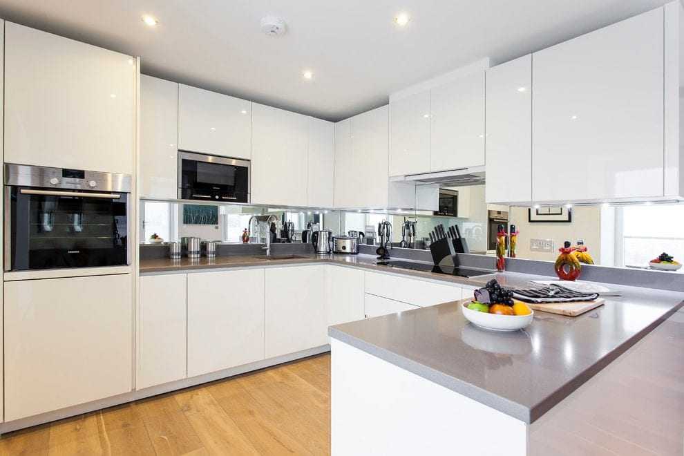 Полуостров с барной стойкой и зеркальный кухонный фартук