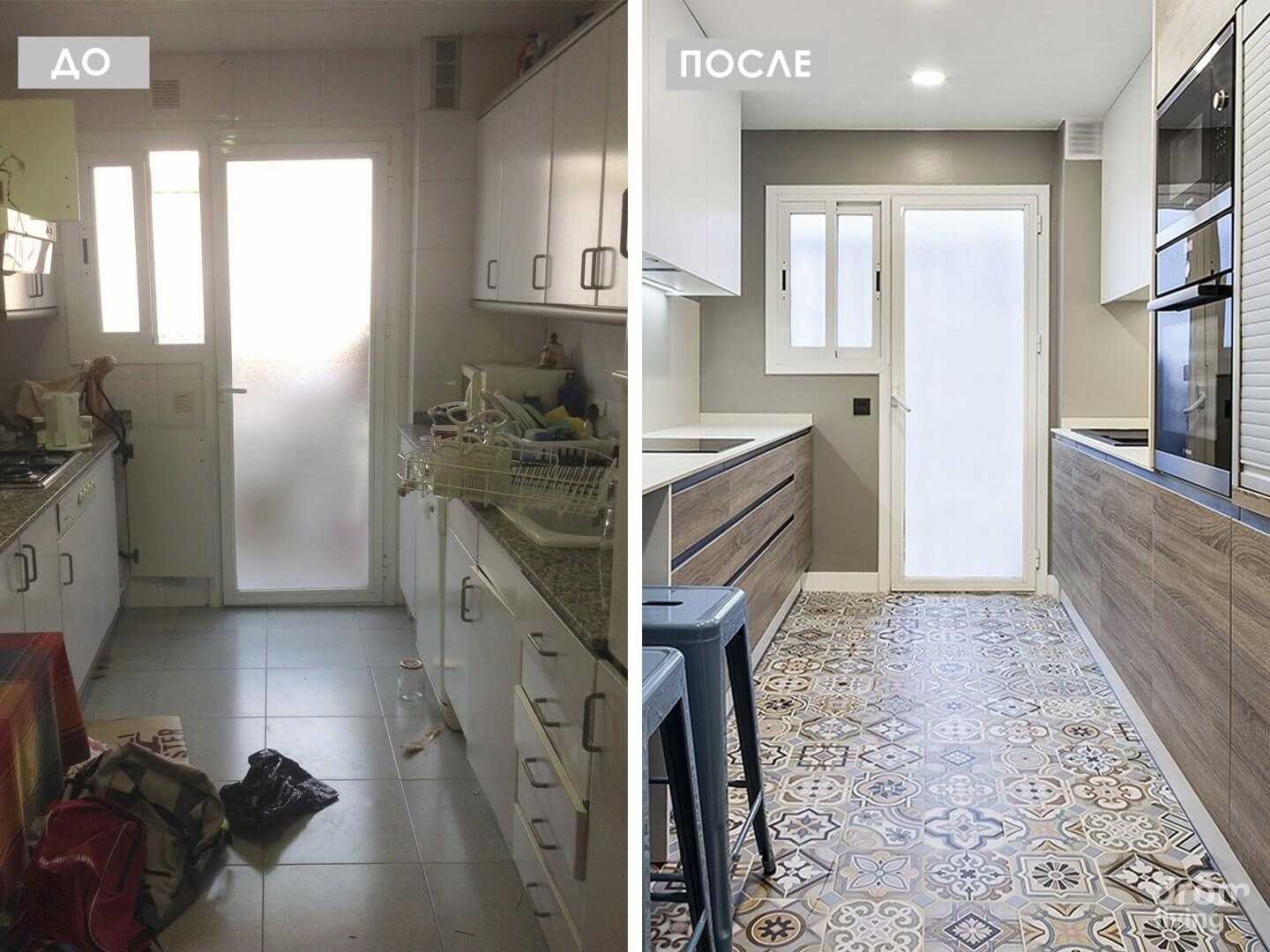 На фото выше вы можете рассмотреть потрясающий ремонт узкой и длинной кухни в современном стиле.