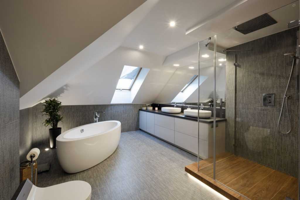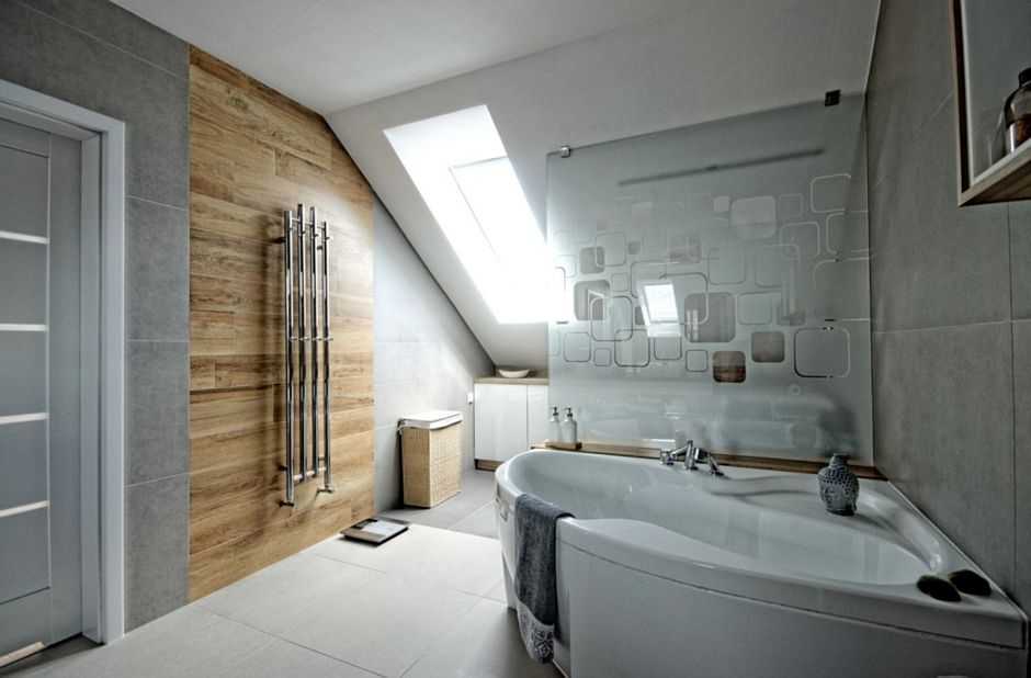 Приобретая бра для ванной комнаты обращают внимание на абажуры, они по форме должны напоминать сферу или колбу и быть закрытыми. На фото интерьер ванной комнаты на мансарде с точечным освещением, встроенным в натяжной потолок
