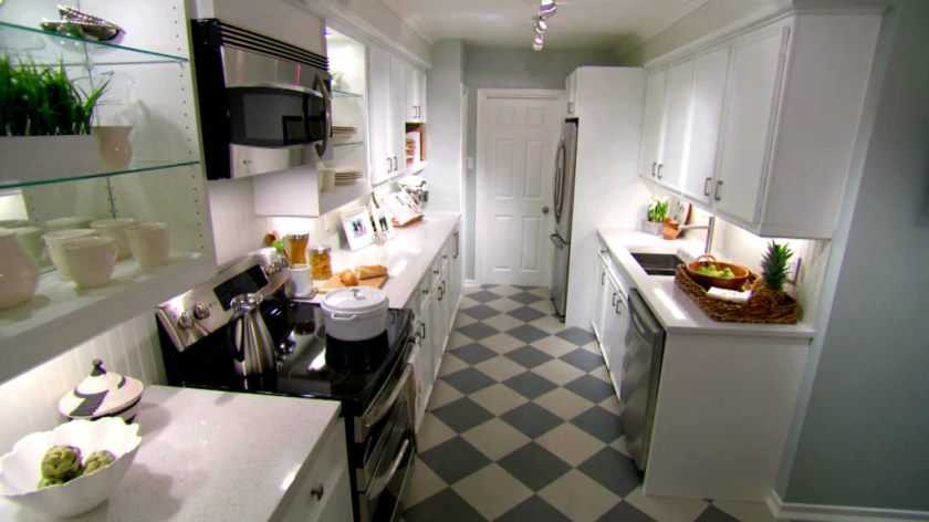 Линейный способ. Подходит для узкой и вытянутой комнаты. Кухонный гарнитур располагается в один ряд с холодильником, чтобы не загромождать пространство. Это позволяет разделить рабочую и столовую зоны, установив их друг напротив друга.