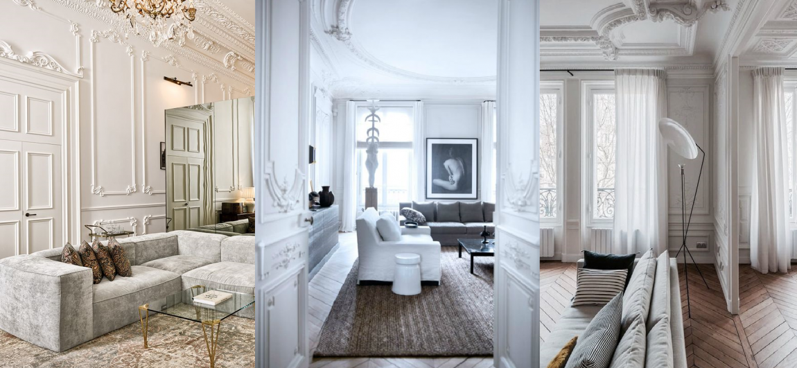 Лепниной, чаще всего белой гипсовой, иногда с позолотой, декорируют высокие белые потолки. В парижских квартирах старого фонда лепнина всегда идет в дуэте с паркетом, он может быть тёмным или светлым, матовым или глянцевым, главное, чтобы был выложен «ёлочкой». Фактура паркета визуально согревает интерьер, уравновешивая «прохладный» эффект минималистичных светлых стен — ещё одной составляющей парижского стиля в интерьере.