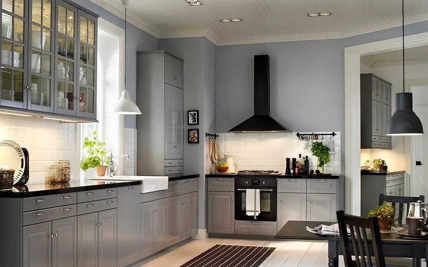 Тон кухонного гарнитура, занимающего 60-70 % площади помещения, во многом создает его образ и определяет общую ауру интерьера. Серый мебельный ансамбль может быть выполнен в строгой гладкой технике или декорирован резьбой и изысканной фурнитурой.