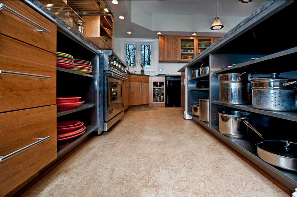 На фото минималистичный интерьер кухни с темным линолеумом цвета венге на полу.