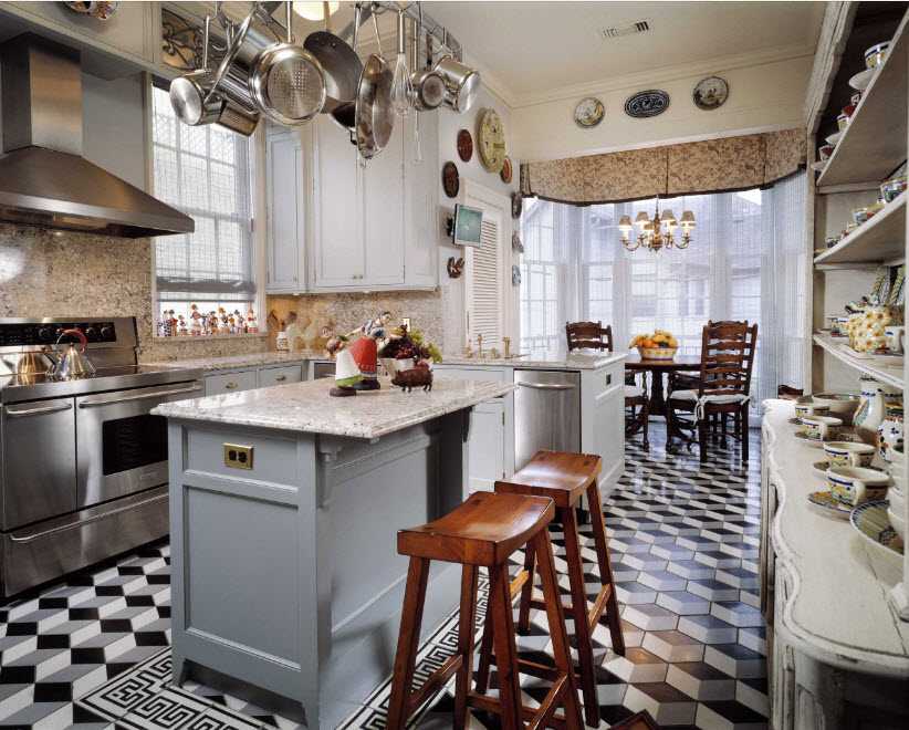 Обычно линолеум укладывают в помещениях, оформленных в современном стиле. Но стоит взглянуть на то, как он выглядит в этой классической кухне, былые предубеждения сразу теряют всякий смысл.