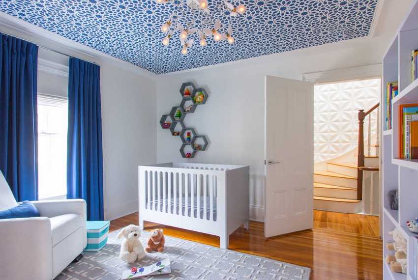 Преимущества такого подхода – вы не теряете высоту помещения. Если вкусы у ребенка поменялись, или вы решили снова сделать ремонт в квартире – очень просто перекрасить потолок в другой цвет и поклеить новые обои.