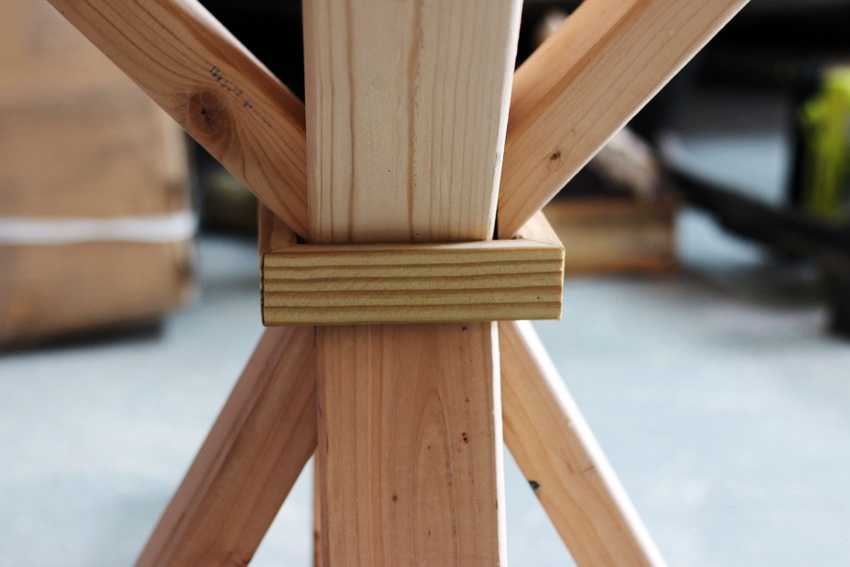 Подобным образом можно самостоятельно изготовить круглый стол на кухню на одной ножке. Потребуется дополнительный квадратный брусок 100х100 мм для основного элемента опоры. Он крепится к центру крестовины. Затем разрезаются пополам заготовленные бруски для ножек (их становится 8), на каждом из них делаются срезы под углом 45° со всех сторон, 4 ножки присоединяются к середине брусков крестовины и к центру основной опоры. Оставшиеся 4 детали фиксируются к середине основного бруска-ножки и расходятся в стороны, увеличивая площадь опоры всей конструкции.
