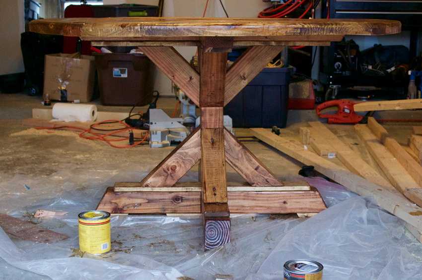 После изготовления круглого стола из дерева своими руками необходимо покрыть изделие лакокрасочными материалами, чтобы увеличить срок его службы