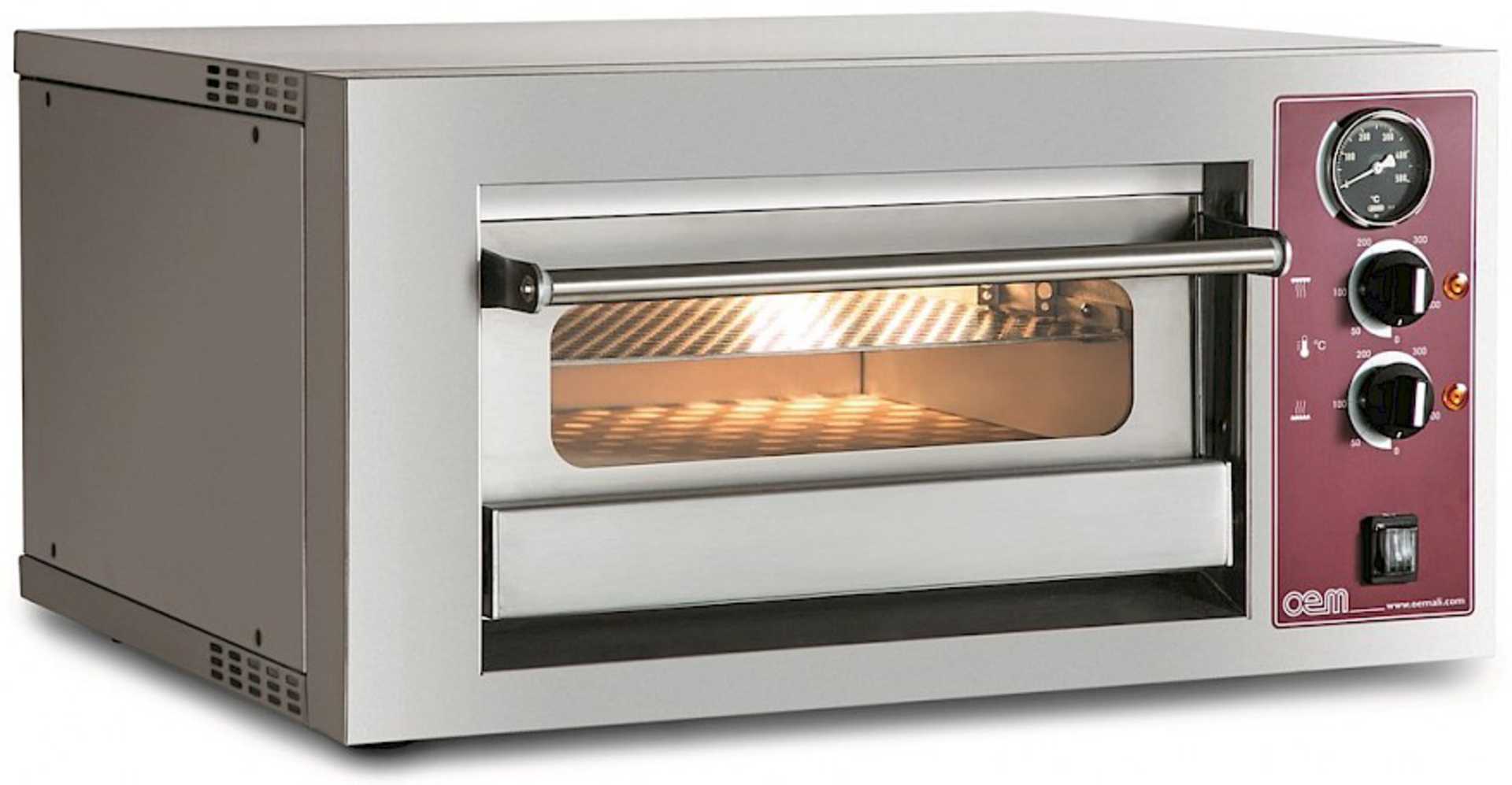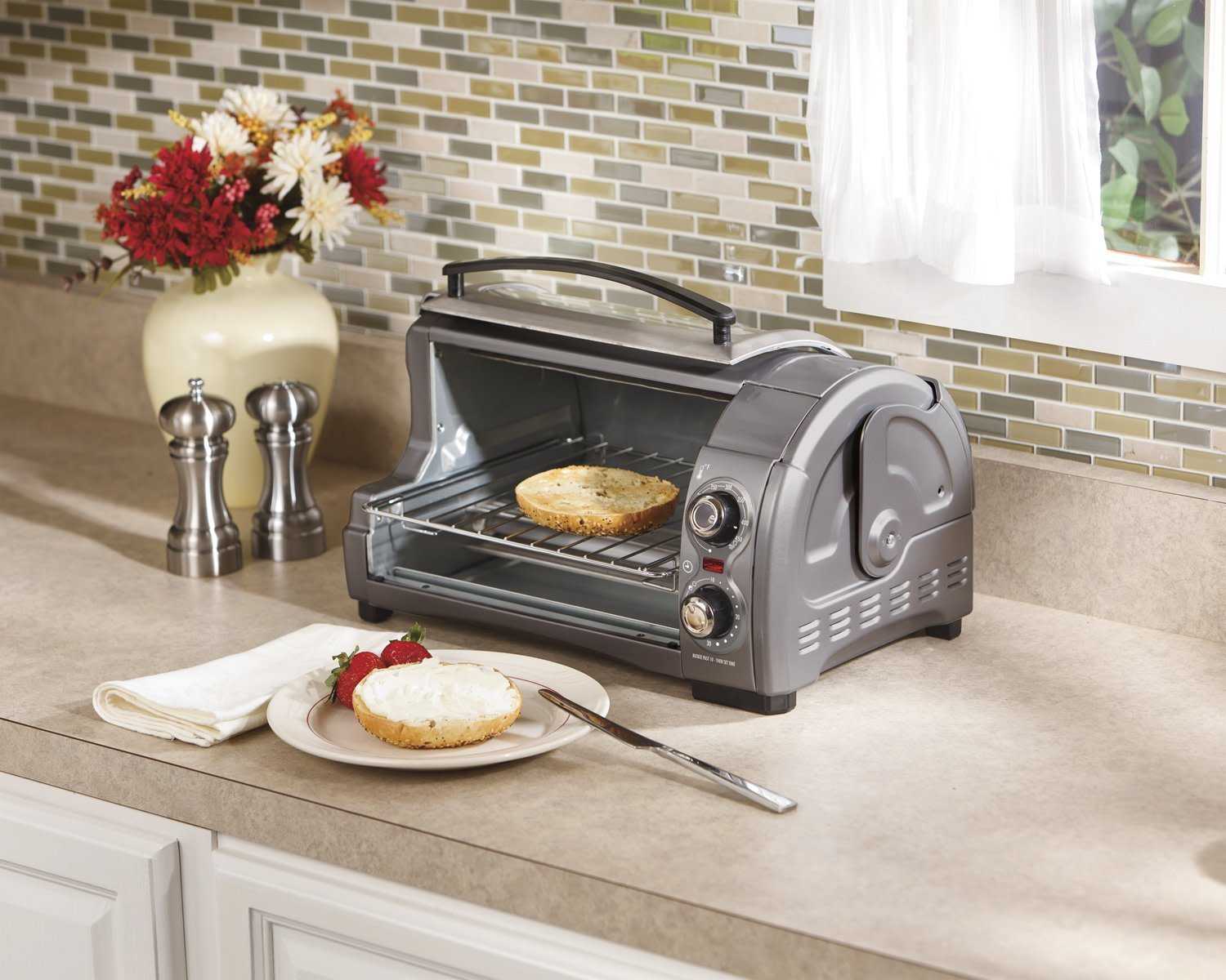 Настольная мини-духовка довольно компактна, хотя для уменьшения размеров производителю пришлось убрать некоторые функции по сравнению с более объемными моделями. Вместительность этой печи составляет 23 л. Открывание двери откидного типа, управление — механическое, а размеры 46×28×39 см. Прибор комплектуется решеткой, вертелом, сковородой, поддоном для крошек, а также специальными ручками для безопасного изъятия аксессуаров.