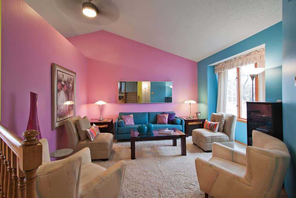 Прекрасно подружатся розовый и голубой цвета. Причем здесь можно применять оттенки ярче и насыщеннее, чтобы гостиная выглядела смело и экспрессивно. Кстати, добавить зеленый здесь тоже не помешает — это почти родственный голубому цвет, который сделает дизайн комнаты еще красочнее.