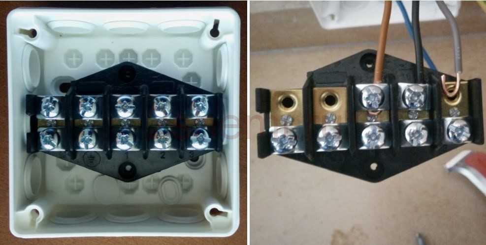 Внутри неё расположена клеммная колодка, с подключенными к ней проводами электрического кабеля.