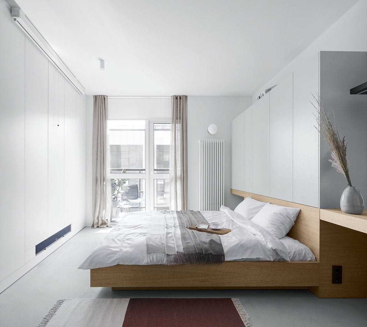 Предвкушая вопрос — нет, это не будет выглядеть неуютно. Это очень простое правило: отделка с прямоугольными правильными формами, смягчение и плавные линии за счёт текстиля, штор и мягкой мебели, которых в спальне хоть отбавляй.