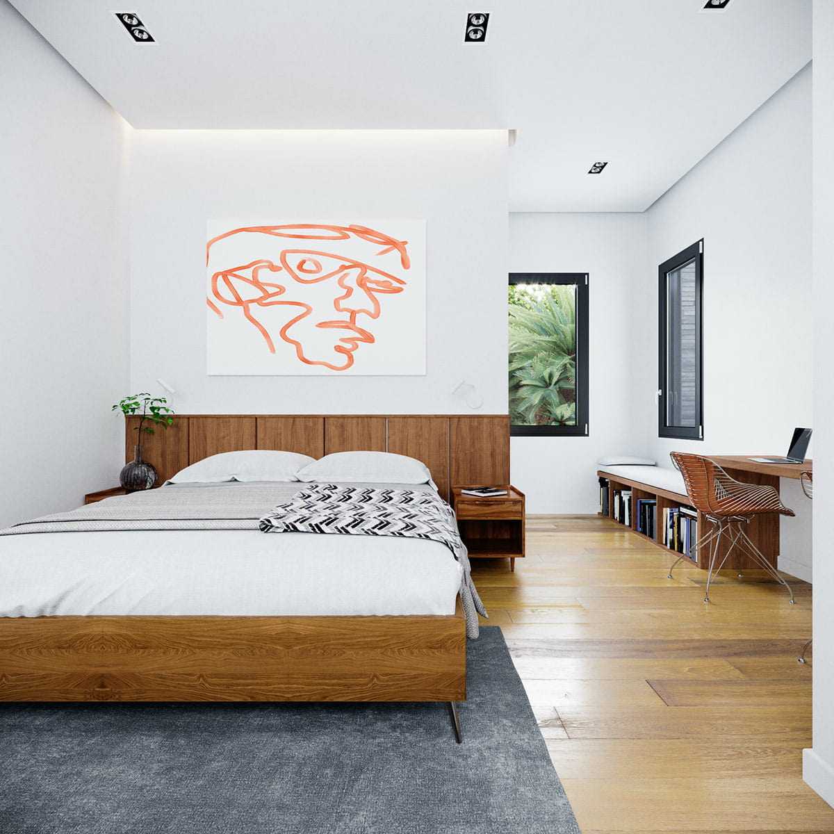 Базовый цветовой рецепт спальни в современном стиле: нейтральный фоновый цвет + дерево или имитация дерева + неяркий/ненасыщенный/грязный акцентный цвет + тёмные участки с подсветкой. Последнее — крутая фишка, особенно в спальне, где должно быть много неосновного света.