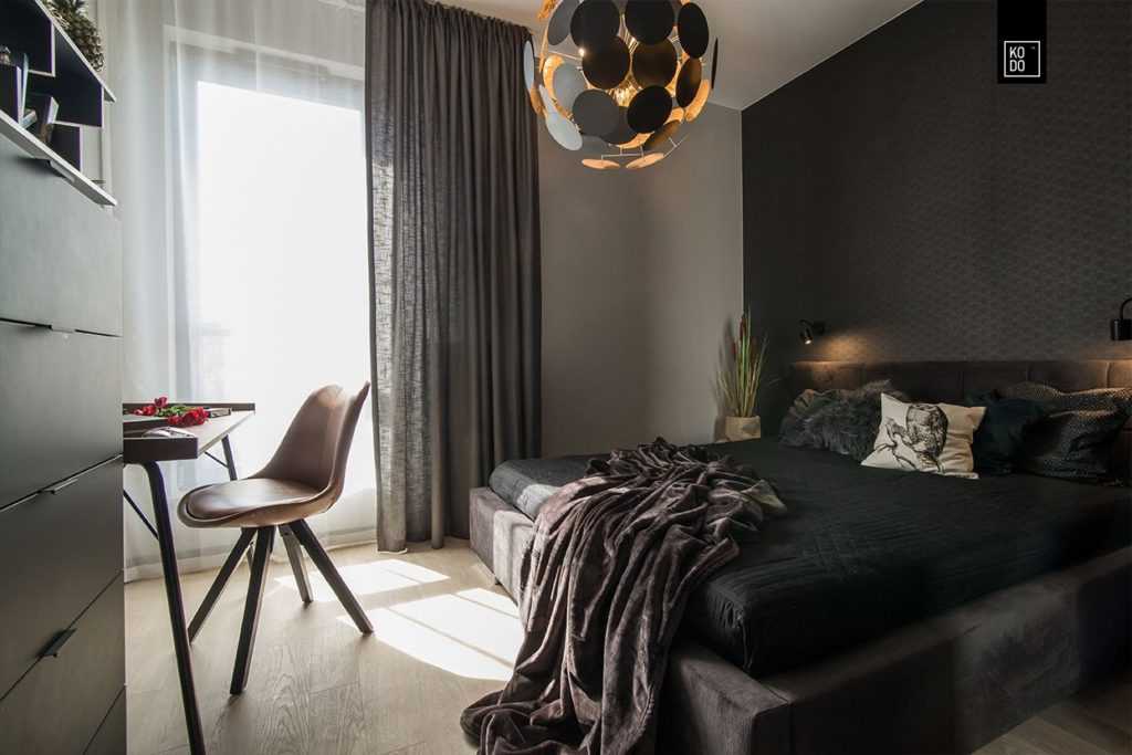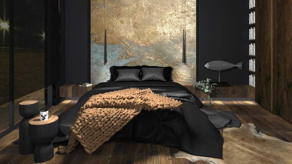 Говоря об интерьере спальни в темных тонах, стоит уделить внимание не только мебели, но и другим элементам интерьера полам, мебель, аксессуарам и текстилю