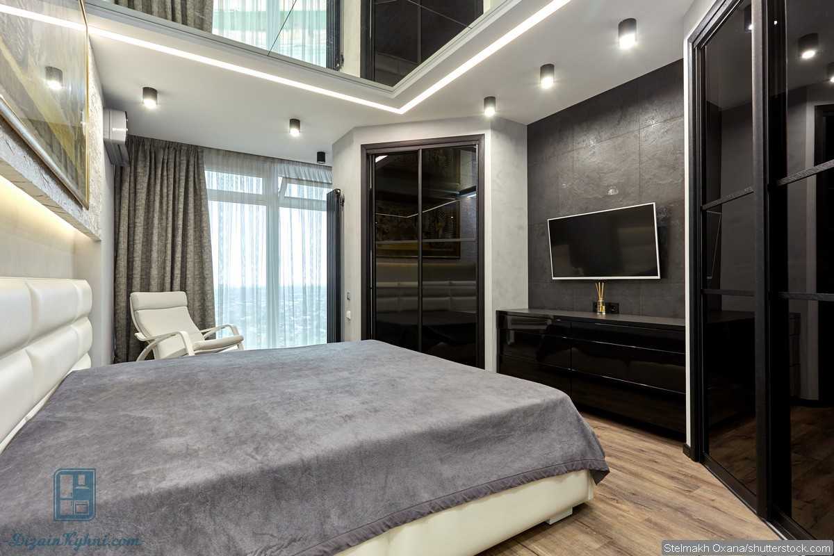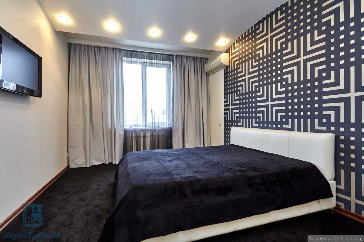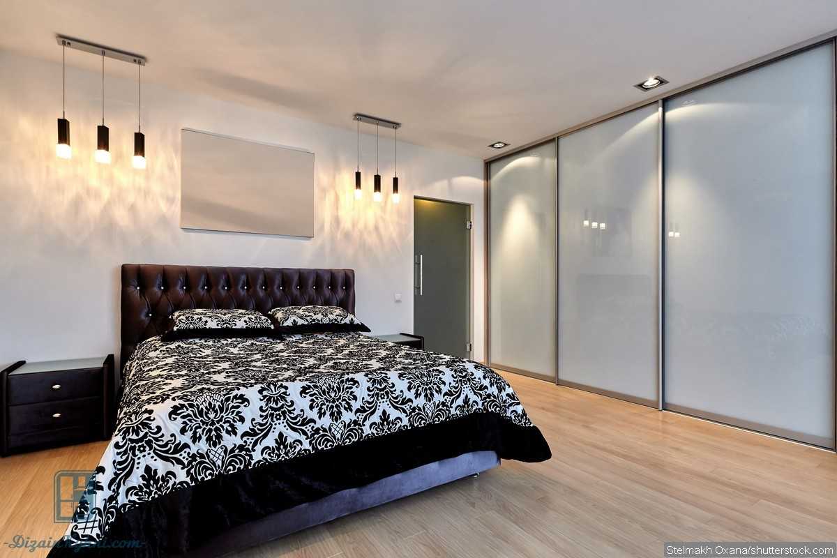 Обстановка в помещении не должна быть однообразной. Комната, выполненная исключительно в белом цвете, напоминает больницу. А вот дизайн спальни в светлых тонах в современном стиле с преобладанием белого и одной контрастной черной стеной – отличный вариант.