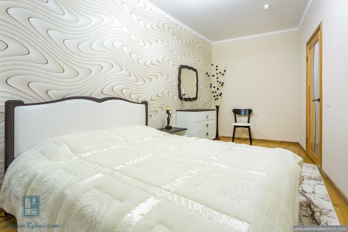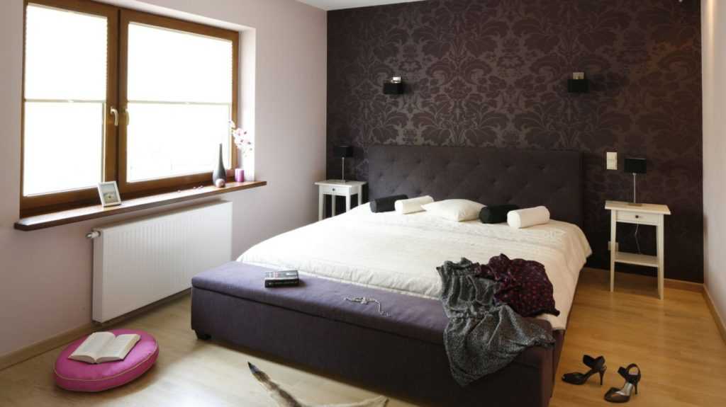 Выбирать обои нужно, отталкиваясь от габаритов вашей спальной комнаты. Так вы сможете правильно обыграть пространство. В большой комнате можно поклеить только однотонные обои или сделать аккуратное панно с помощью фотообоев или обоев с узорами.