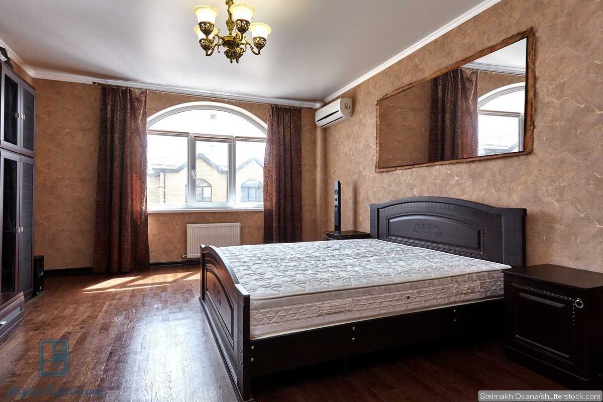 Дизайнеры не рекомендуют делать над изголовьем темные стены, а саму кровать лучше всего выбирать коричневой или черной, это ее выделит на общем фоне и гармонично объединит с другими элементами декора, текстилем. Шкафы же наоборот нужно подбирать под отделку помещения, на темных стенах красиво смотрится мебель белого, молочного цвета. Комод, кресла и туалетный столик могут быть из светлого дерева.
