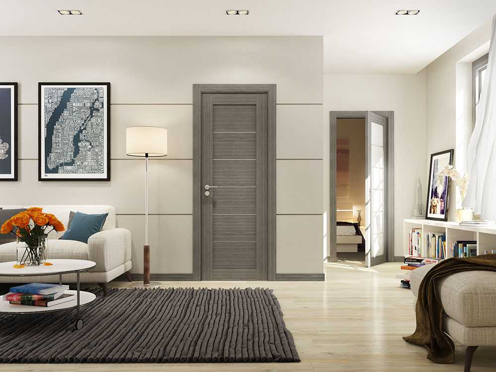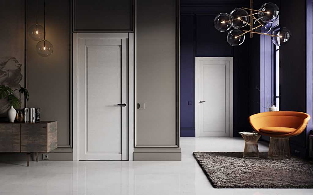 Если вы хотите выбрать максимально универсальный вариант оформления интерьера, то, не задумываясь, покупайте серые межкомнатные двери. Такие модели смотрятся стильно и придают строгую лаконичность всему дизайну помещения. Это самый приближенный к классическим тёмным дверям вариант.