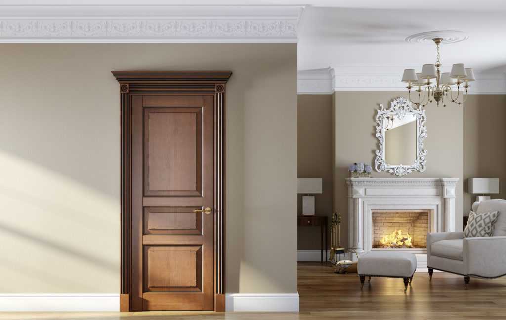 В классическом интерьере часто применяется двери из березы с объемными вставками и резными наличниками