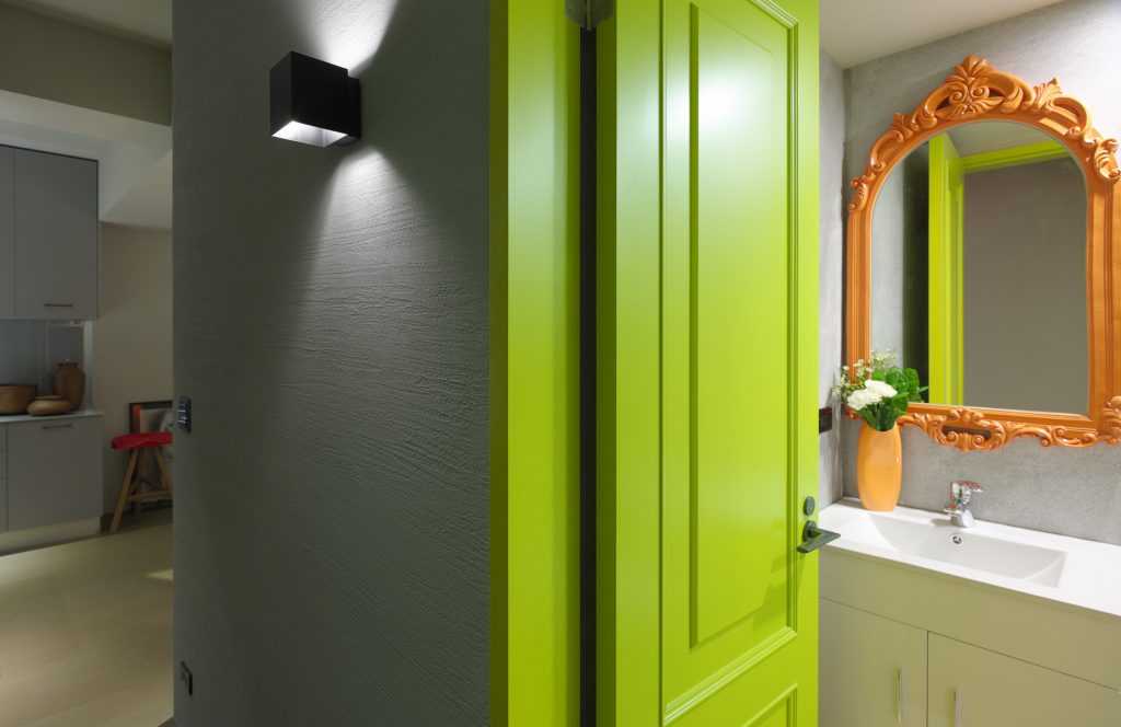 Не нужно делать ставку на серый цвет для всего жилого помещения, если подобран популярный оттенок двери с великолепным дизайном вставок. Это может навевать печаль, необходимы яркие ударения для настроения.