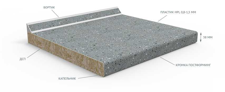 Такие столешницы изготавливают из прочного влагостойкого ДСП с классом эмиссии Е1. На рабочую поверхность наносят лист древесно-слоистого пластика HPL толщиной 1 мм. Под давлением пресса и под воздействием высоких температур происходит склейка двух компонентов.