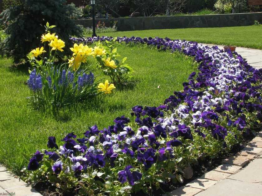 Анютины глазки или виола – наиболее известное и популярное растение, имеющее большое количество расцветок (желтая, синяя, белая и пр.). Эти цветы предпочитают солнечные участки с умеренной влажностью;