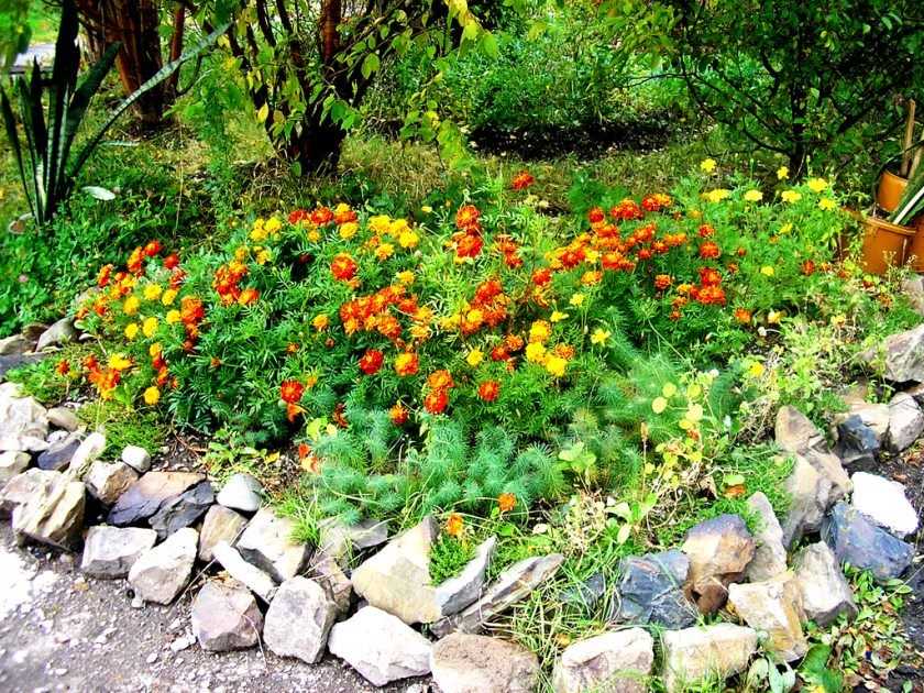 - Бархатцы – небольшие компактные кустики, эффектно расцветающие в конце весны и продолжающие цвет до осени. Растение не привередливо – подходит как тень, так и прямые солнечные лучи;