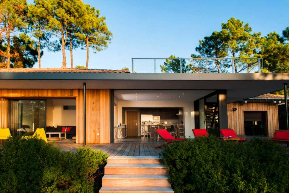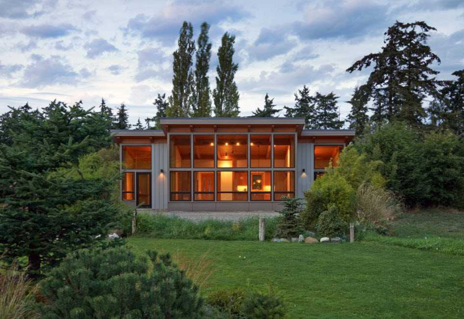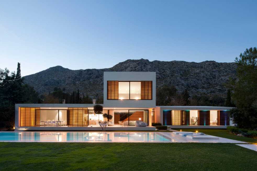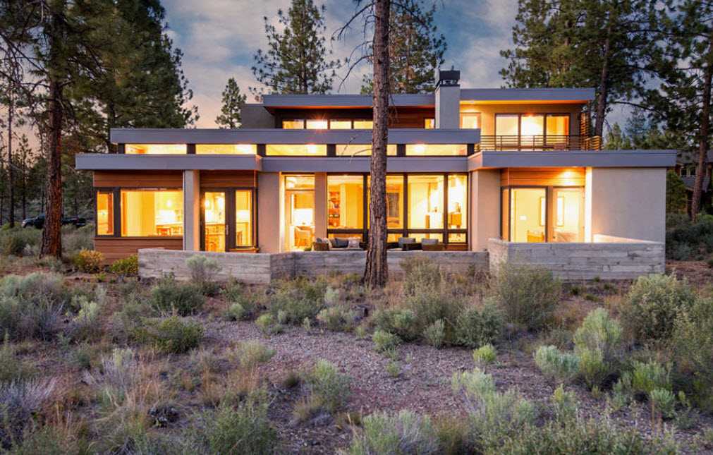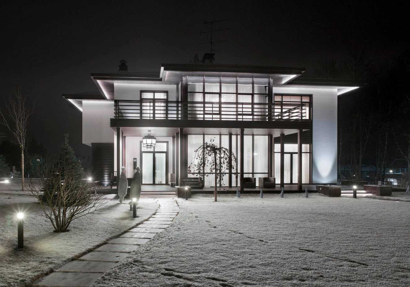 Минимализм – стиль наиболее близкий к конструктивизму. Он пользуется невероятной популярностью, потому что не просто придает современный вид загородным домам, а, как ни странно это звучит для тех, кто не понаслышке знаком с особенностями такого направления, отлично вписывает их в любой природный ландшафт, будь то густой лес, степная местность или речной берег. В отделке фасада дома абсолютно отсутствуют украшающие детали, однако, не обратив внимания на него, пройти мимо будет нельзя. Восторг вызовет отлично подобранная цветовая гамма, эффектная облицовка стен и, конечно же, большие окна.