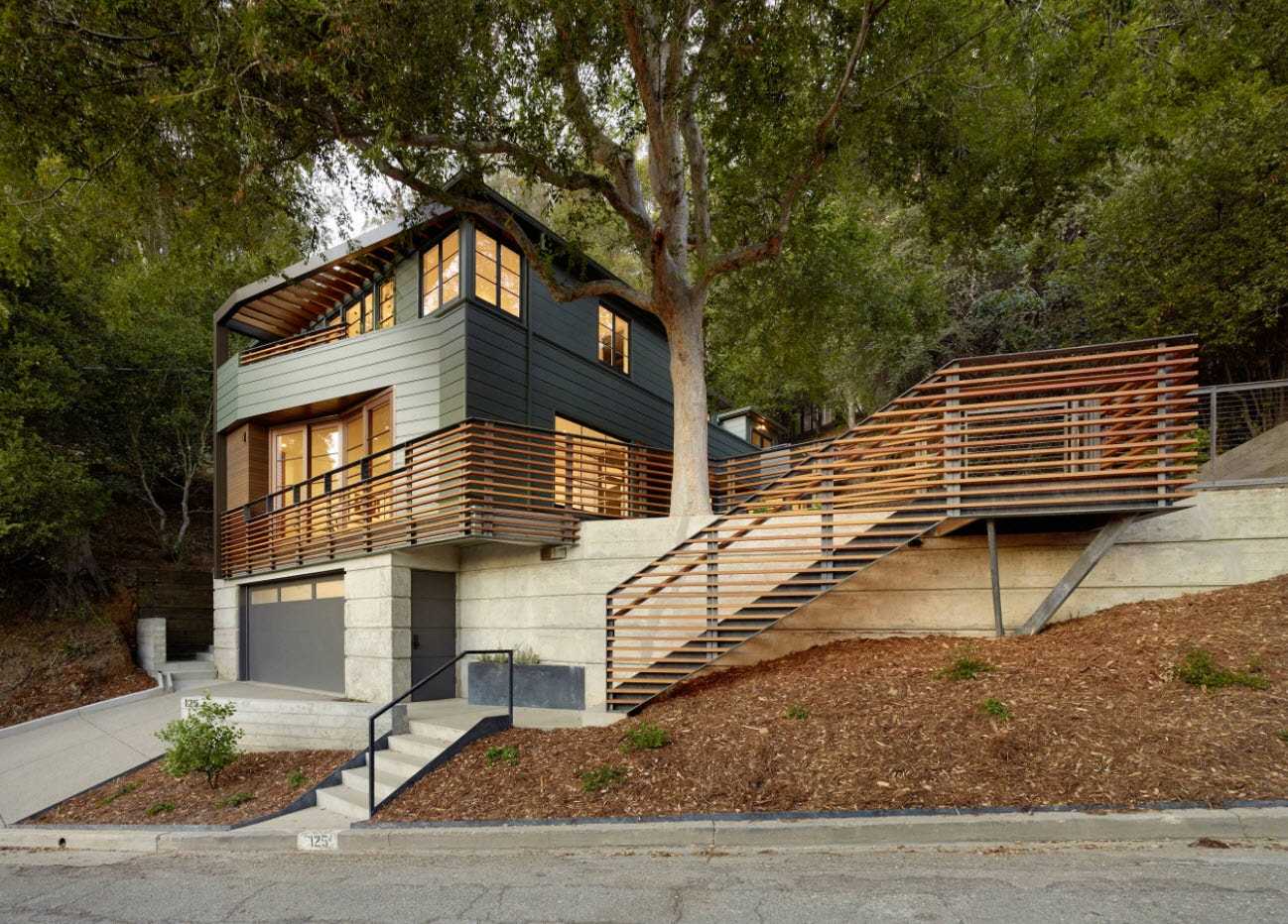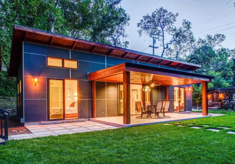 Основными принципами стиля хай-тек являются функциональность и удобство. Отделка фасада дома, построенного в этом стиле, осуществляется с использованием металла, пластика и стекла. Дизайн здания характеризуется неприхотливостью и суровостью, усиливаемой преобладанием черного, белого и стального цветов.