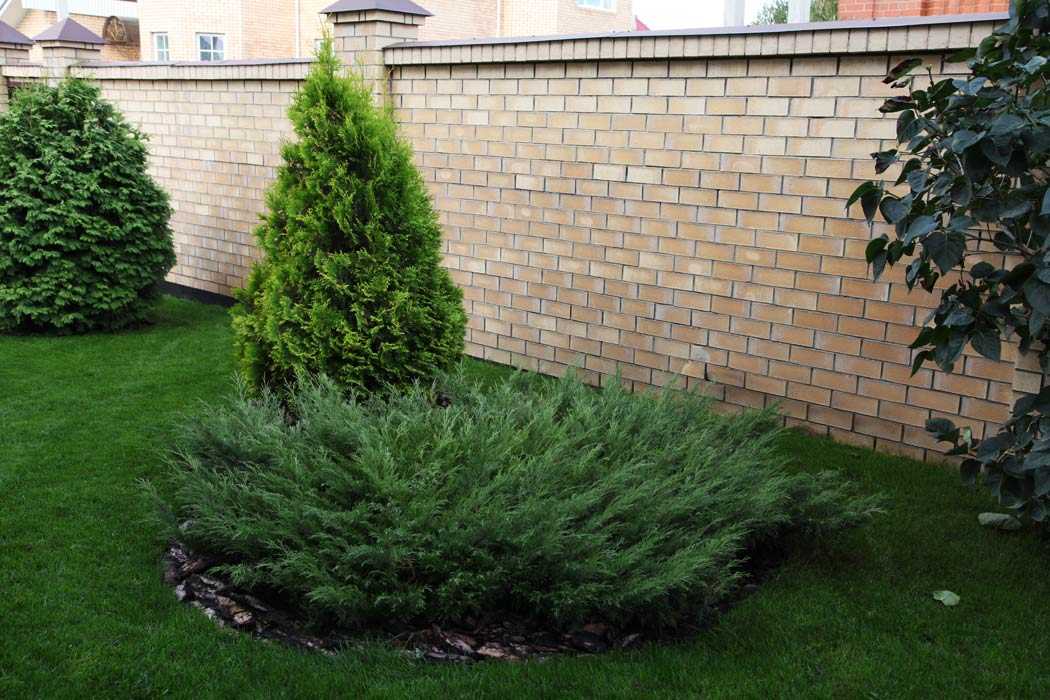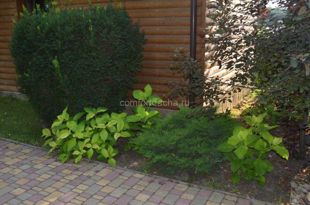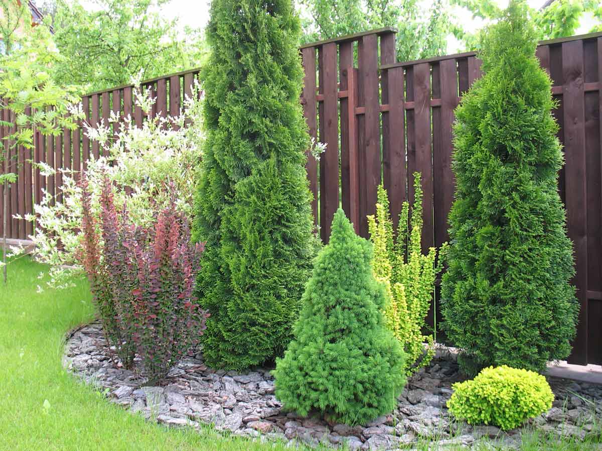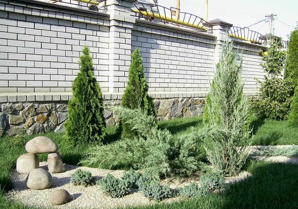 Микс из хвойников и листопадных кустарников беспроигрышный вариант украшения территории вдоль забора: