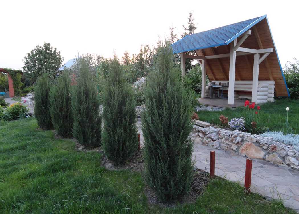 Другим удачным соседом для роз станут кусты можжевельника сортов Скай Рокет и Блю Арроу.