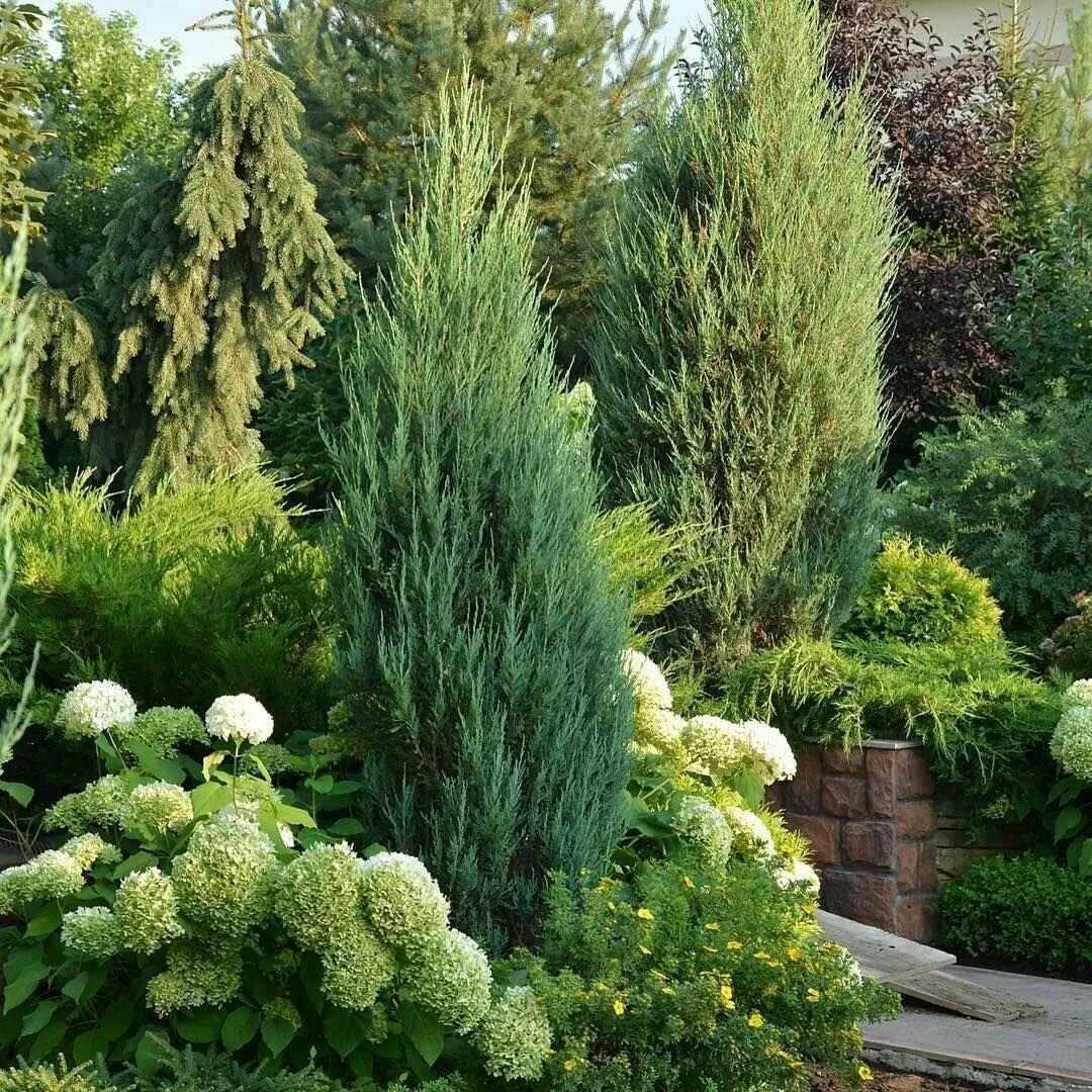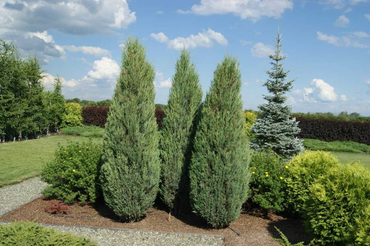 Коническая (горная сосна, можжевельник скальный «Блю Арроу», сербская и сизая ель, сосна черная «Пирамидалис»);