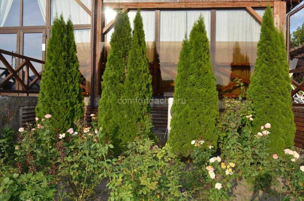 Желательно, чтобы расстояние между туей и розой превышало 1,5 метра. Если на клумбе уже есть розы, которые растут здесь несколько лет, можно смело сажать тую близко от розы. Она не повлияет отрицательно на крепкую корневую систему роз старше 5 лет.
