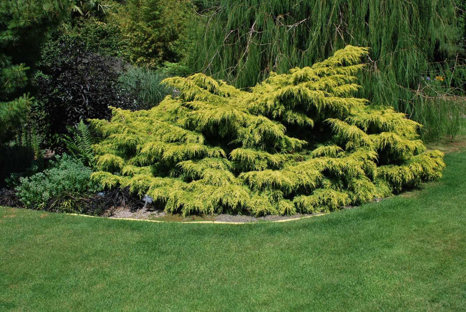 Стелющаяся (горизонтальный и распростертый можжевельник, тсуга, лиственница японская, кедр атласский «Глаука Пендкла», Карпет Блю).