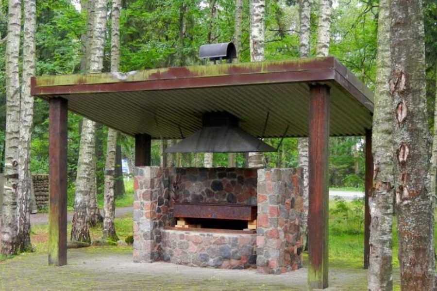Чтобы пользоваться мангалом или печкой даже зимой, делай закрытую или полузакрытую беседку. Выбирай пожаробезопасные материалы, которые меньше коптятся – например, камень или кирпич.