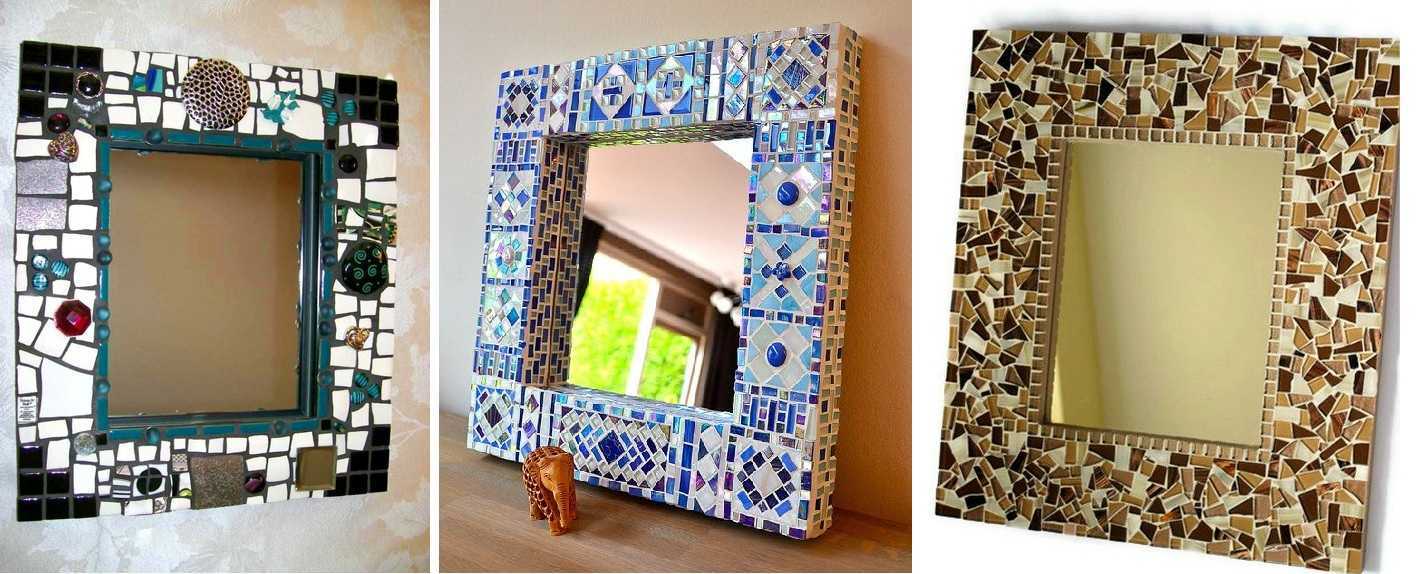 Мозаика. За основу можно взять картон, в центр приклеить зеркало, а вокруг обложить мозаикой из плитки. Зазоры заделываются обычной замазкой для плитки.