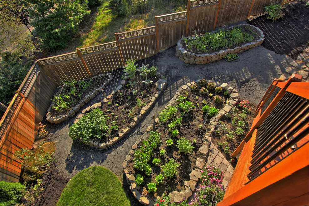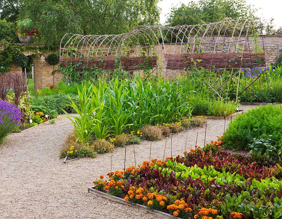 Предлагаем вашему вниманию наиболее популярные решения для дизайна огорода в общей стилистике.
