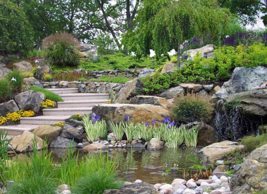 Клумбы, цветники, рокарии, альпийские горки располагают с учетом рельефа