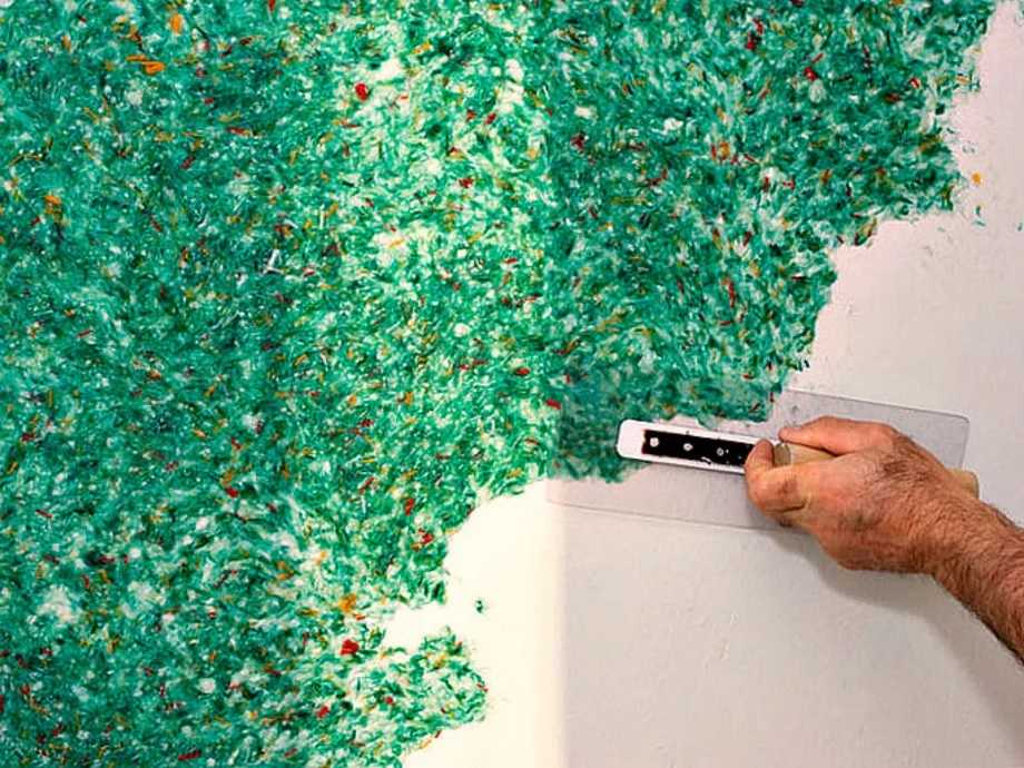 - способность маскировать дефекты стен — масса заполняет собой мелкие вмятины, а большие становятся незаметными из-за пёстрого рисунка (материал состоит из ворсинок разного оттенка и фактуры, поэтому выглядит неоднородно);