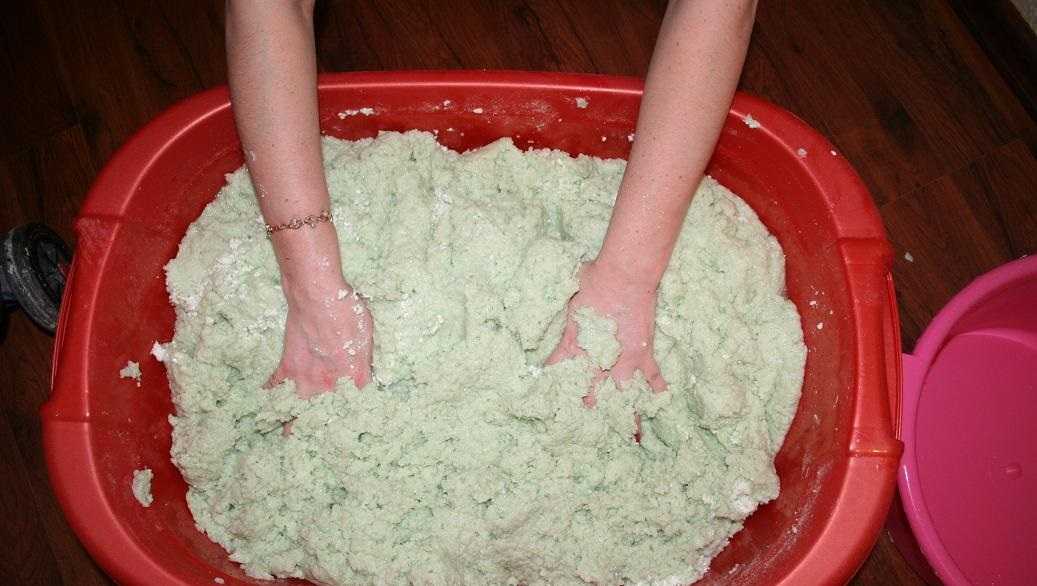 - Разминайте густую массу до получения однородной консистенции раствора. Не забудьте использовать для этого резиновые перчатки.