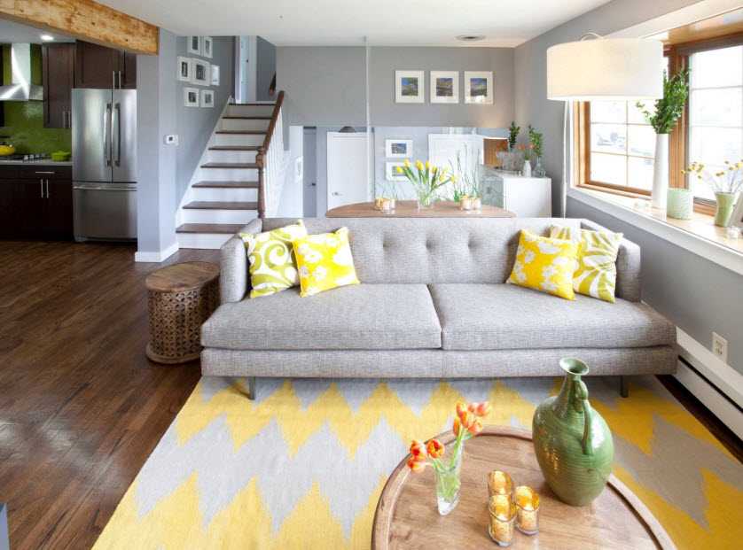 Ищите смелые решения? Комбинируйте серый с желтым. Этот вариант будет самым ультрамодным и актуальным. Серому всегда не достает яркости и живости – все это можно найти в желтом оттенке. Но здесь есть одно «но» — если стены темно-серые, оттенить их можно сочным желтым цветом, а светло-серые стены гармонируют с розово-желтым, песочным и бледным желтым тоном.