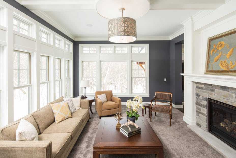Эта красивая серая гостиная с люстрой на фото выше, выглядит впечатляюще, сочетаясь с белой лепниной. Такой серый, является одним из самых популярных оттенков, используемых в качестве цвета стены из-за его универсальности. Он не слишком темный и не слишком светлый, и просто добавляет современную привлекательность, которая подходит для пространства, в котором вы его используете. В приведенном выше примере вы увидите, что в гостиной используется мебель кремового и темно-синего цвета, с деталями и классическими силуэтами.