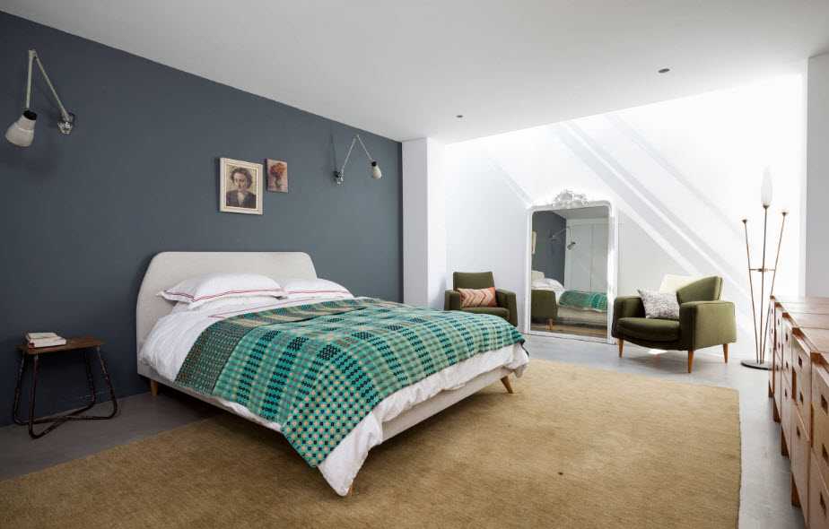 Например, обои серо-зелёные, а краска светло-жёлтая. Краска поддержана изголовьем кровати, а обои — зелёным покрывалом и серым ковром.