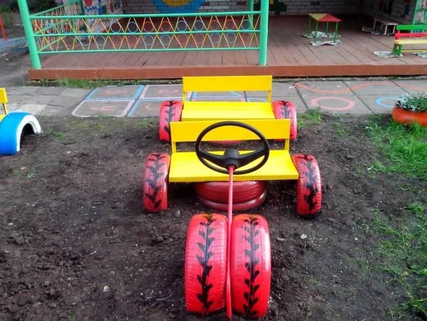 Машина из покрышек, в качестве сидений вставлены детские стульчики.